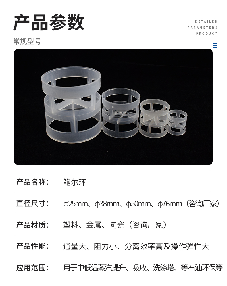 鮑爾環填料是采用金屬薄板沖扎制成,在環壁 上開出了兩排帶有內伸舌葉的窗孔,每排窗有五個舌葉彎入環內,指向環心,在中心處幾乎相搭,上下兩層窗孔的位置相互錯開,一般開孔的總面積約為整個環面積的35%左右。
