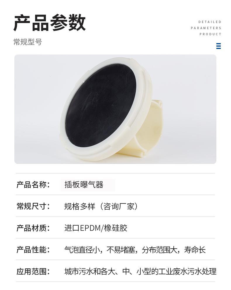 插板曝氣器由底盤(pán)、布?xì)獗P(pán)、合成橡膠膜片、壓固圓環(huán)、空氣導(dǎo)流板、連接底座與配氣管連接的連接件組成。底座由ABS塑料制成,底座與壓固圓環(huán)上均有螺紋,EPDM橡膠膜片覆蓋在空氣均流板上,在固定圈的作用下能保證在膜片(周圍不漏氣,橡膠膜片在有均勻分布的孔眼,該種橡膠膜片采用多道特殊工藝加工而成,其性能穩(wěn)定,耐中濃度酸、堿、油等介質(zhì)。