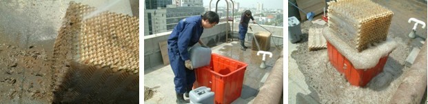 由于冷卻塔長年暴露在外,風扇的吸附力很強,使大量的泥沙、污物進入塔內,長時間運行會使冷卻塔慢慢的降低散熱能力,布水器出水孔很容易堵塞,泥沙及污垢也很容易進入冷卻水系統中去,將直接影響冷卻水系統的正常制冷。為了防止上述情況發生,將損失將到最低,必須對冷卻塔進行定期清洗。
